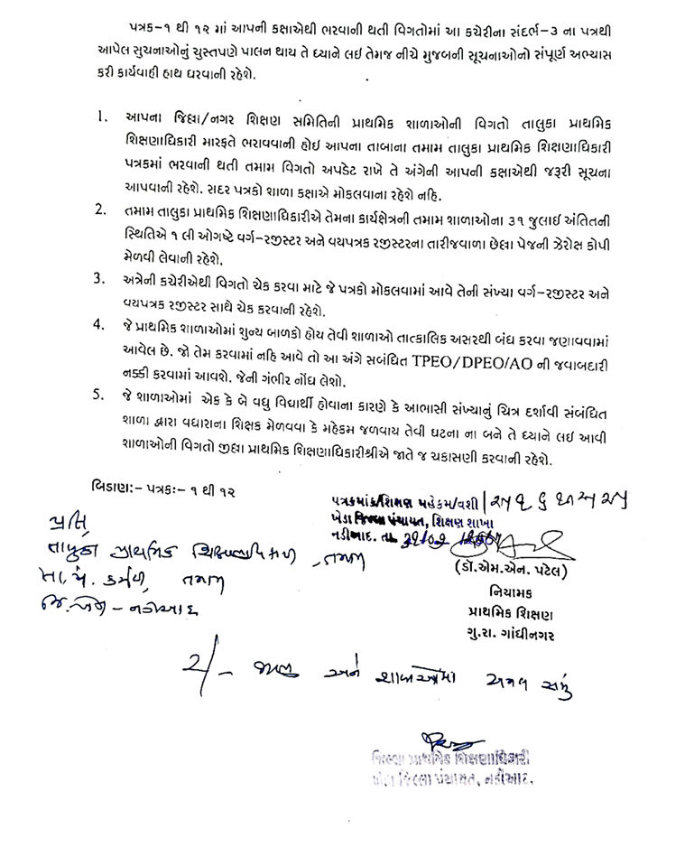 પ્રાથમિક શિક્ષણ નિયામક કચેરીએ વધુમાં જણાવ્યું કે 31 જુલાઈની કટ ઑફ ડેટના આધારે દરેક શાળામાં દાખલ તમામ વિદ્યાર્થીઓની વિગતો CTSE પોર્ટલ પર અપલોડ કરવી ફરજિયાત છે. ઉપરાંત, SAS પોર્ટલ અને Teacher Portal પર પણ વિદ્યાર્થીઓ અને શિક્ષકોની વિગત અપડેટ કરવાની રહેશે.